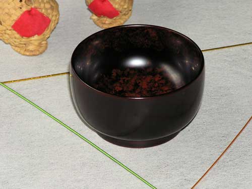 全体が溜塗で 内面の底とフチ周りに華模様を塗りました